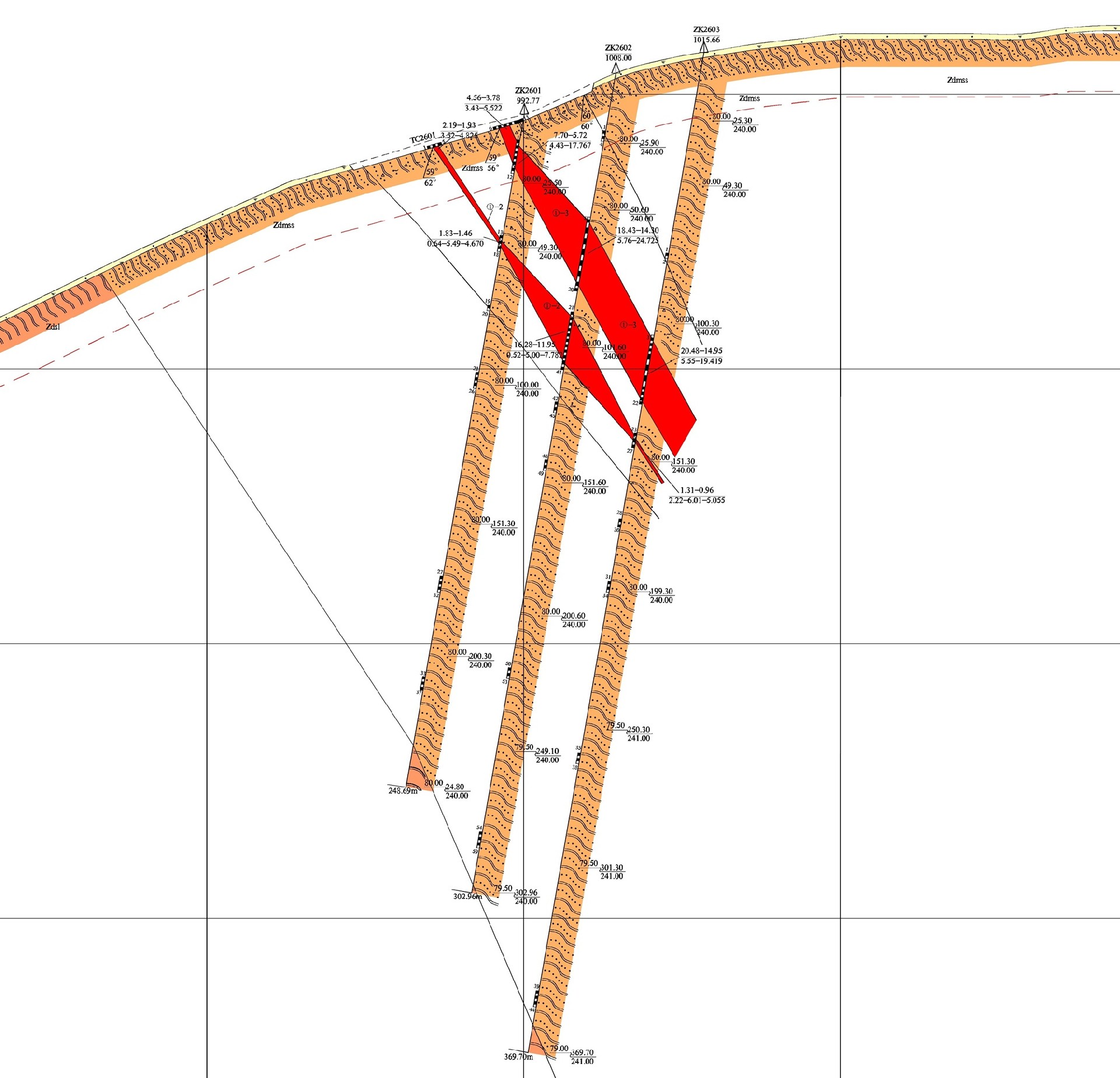 該探礦權(quán)于2003年首次設(shè)立,探礦權(quán)面積2.**km2,經(jīng)多次延續(xù)后面積縮減為1.**km2,許可證號(hào)為T15120080802******20132014年對(duì)進(jìn)行詳查工作,2016年編制詳查報(bào)告,2016 2017年進(jìn)行勘探工作,2018年完成報(bào)告評(píng)審及備案。全礦區(qū)累計(jì)查明資源儲(chǔ)量(121b+122b+333)礦石量290萬噸,金屬量:Zn15.9萬噸、Pb0.3萬噸、Ag970kg;伴生Pb7400t、伴生Ag46070kg、伴生Cu930t、伴生磁鐵礦石量170萬噸;礦床平均品位:Zn5.32%、Pb0.34%Ag15.7g/t; mFe3.5%