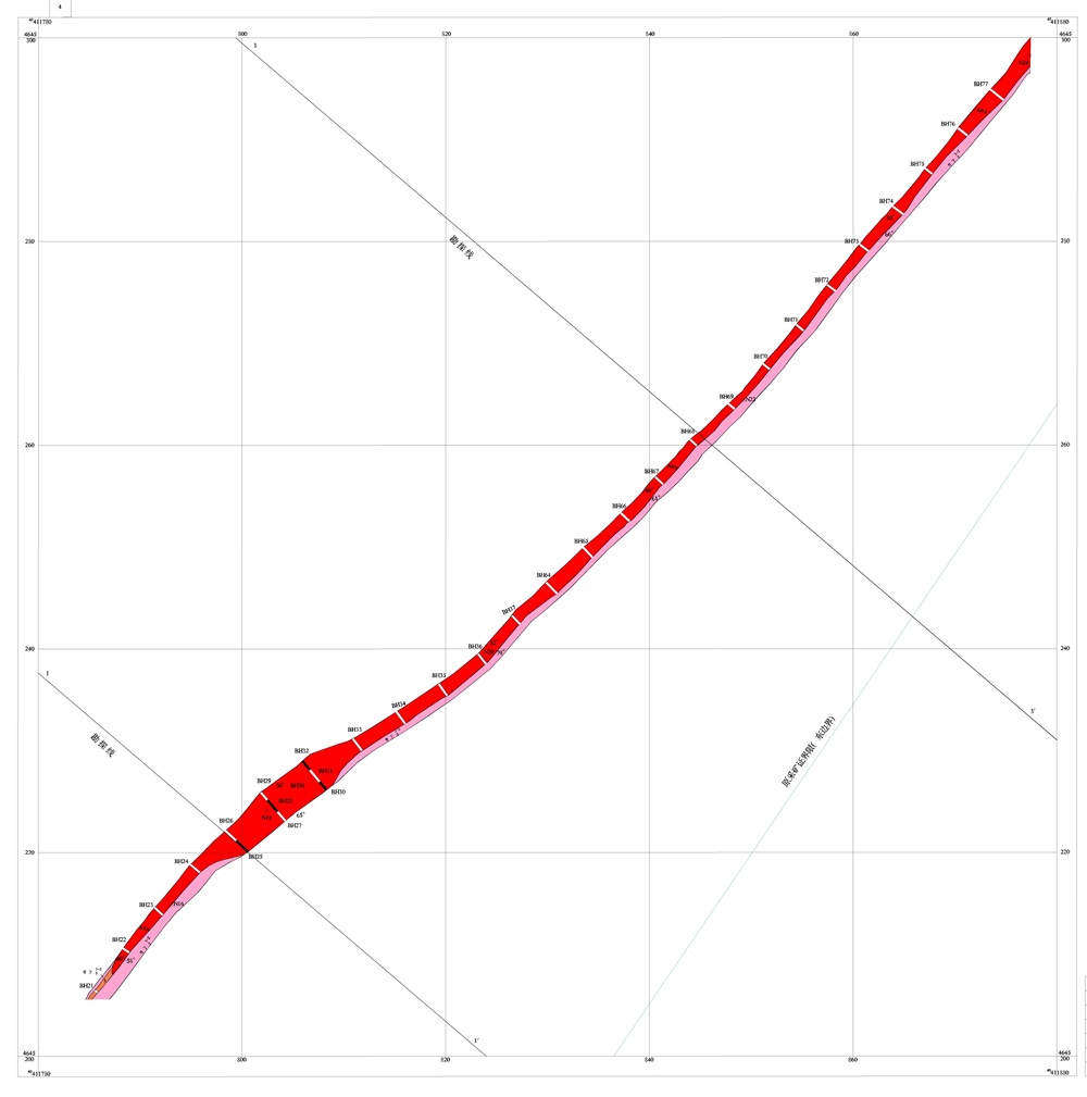 1號礦體(主礦體),位于礦區(qū)東南部,地表長 702m,控制最大斜深 123m,真厚度 0.75-2.20m(平均 1.43m,變化系數(shù) 29.78%),品位 61.35-78.83%(平均 72.36%,變化系數(shù) 9.10%),資源儲量占比78%,由 10 條探槽、3 個鉆孔控制;