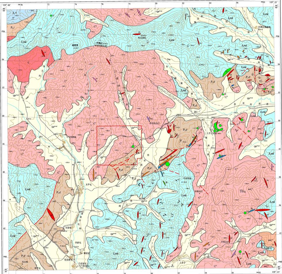 礦區(qū)位處黃崗 — 甘珠爾廟復式背斜北東端,屬黃岡梁 — 甘珠爾廟成礦帶,褶皺、斷裂發(fā)育,巖漿活動頻繁,成礦條件優(yōu)越。礦區(qū)出露地層主要為二疊系中統(tǒng)大石寨組色安山巖、侏羅系上統(tǒng)滿克頭鄂博組流紋質(zhì)晶屑凝灰?guī)r;巖漿巖為燕山晚期鉀長花崗巖;構造以斷裂構造為主,按走向分北東向、北西向、近南北向,其中北北西向構造與成礦關系密切。